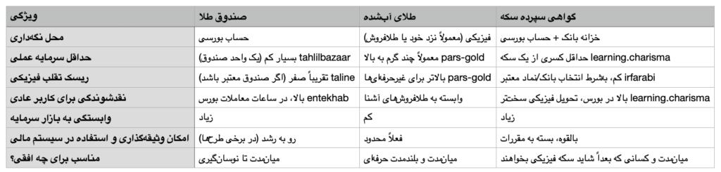 ۳. جدول تصمیمساز: صندوق طلا، طلای آبشده، گواهی سکه در یک نگاه